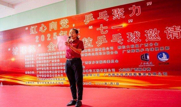 7 月 5 日上午 8 时,为庆祝中国共产党成立 104 周年暨 2025 年 “城建杯” 全区乒乓球邀请赛在南宁市体育场乒乓球馆举行。由广西城建集团有限公司、南宁城建建设集团有限公司、颗粒大联盟广西分会主办;广西中小企业经济互助商会、广西乡村振兴企业助力联合会、广西辉耀乒乓球俱乐部协办,大益茶广西服务商、南宁醇静贸易有限公司、广西汾联酒业有限公司、广西抿元投资控股集团有限公司为本次比赛提供全方位的赞助与保障,让我们能够以饱满的热情和高昂的斗志,共同见证到这场乒乓盛宴!