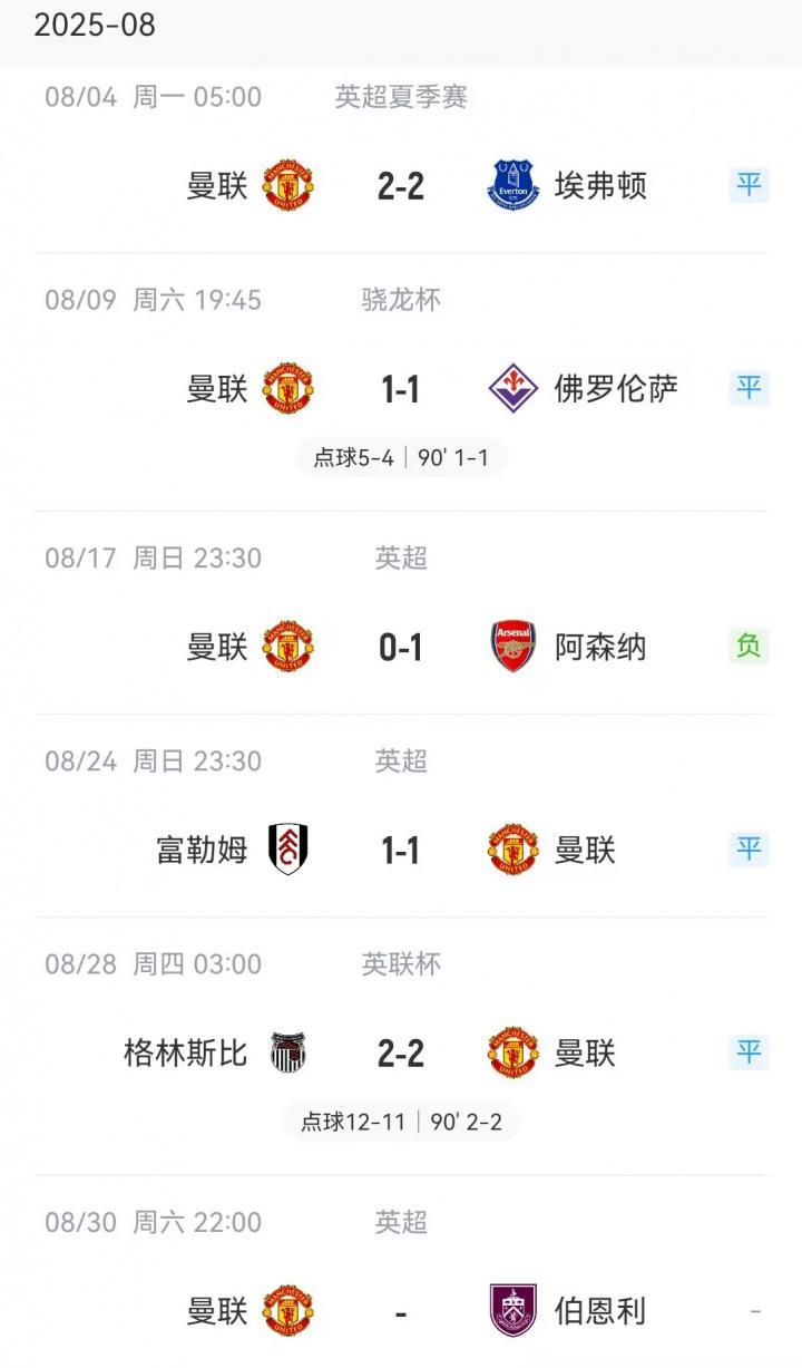 这也是曼联整个8月首场胜利:他们在此前5场比赛中取得4平1负(点球赢佛罗伦萨、点球输格林斯比),终于在本月的最后一场比赛中取得胜利。